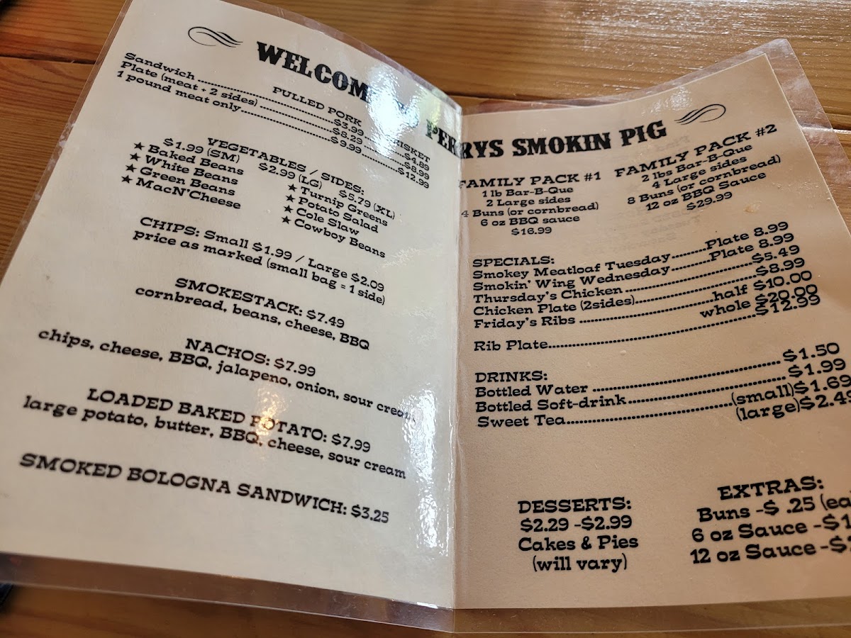 “ Awesome local place. Ribs were tender like a mother's love. Don't miss the cowboy beans. They are awesome. Friendly people. Locals that came in were also friendly. They seemed to all get welcomed by name. Prices were good. Serving sizes were great. Service was Awesome! Like their sign said "smoked for hours served in minutes". The place had a lot of Character. I will difanantly stop here again. If you like pork bbq (and who doesn't) stop by Perry's smoking pig. We even got to meet "Perry". He was manning the smoker himself today. ”